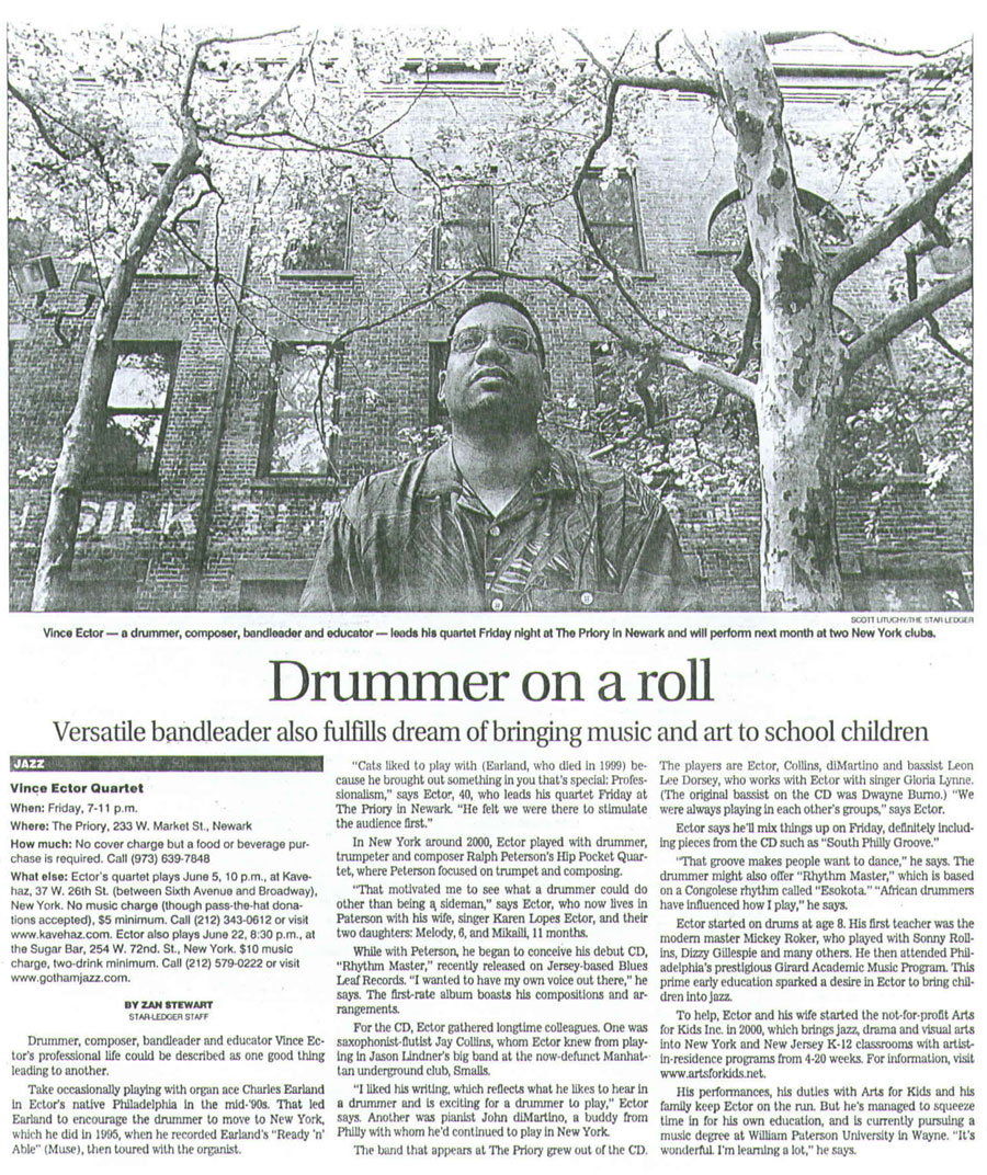 Star Ledger Drummer on a Roll by: Zan Stewart Versatile bandleader also fulfill dream of bringing music and art to school children... read all » |